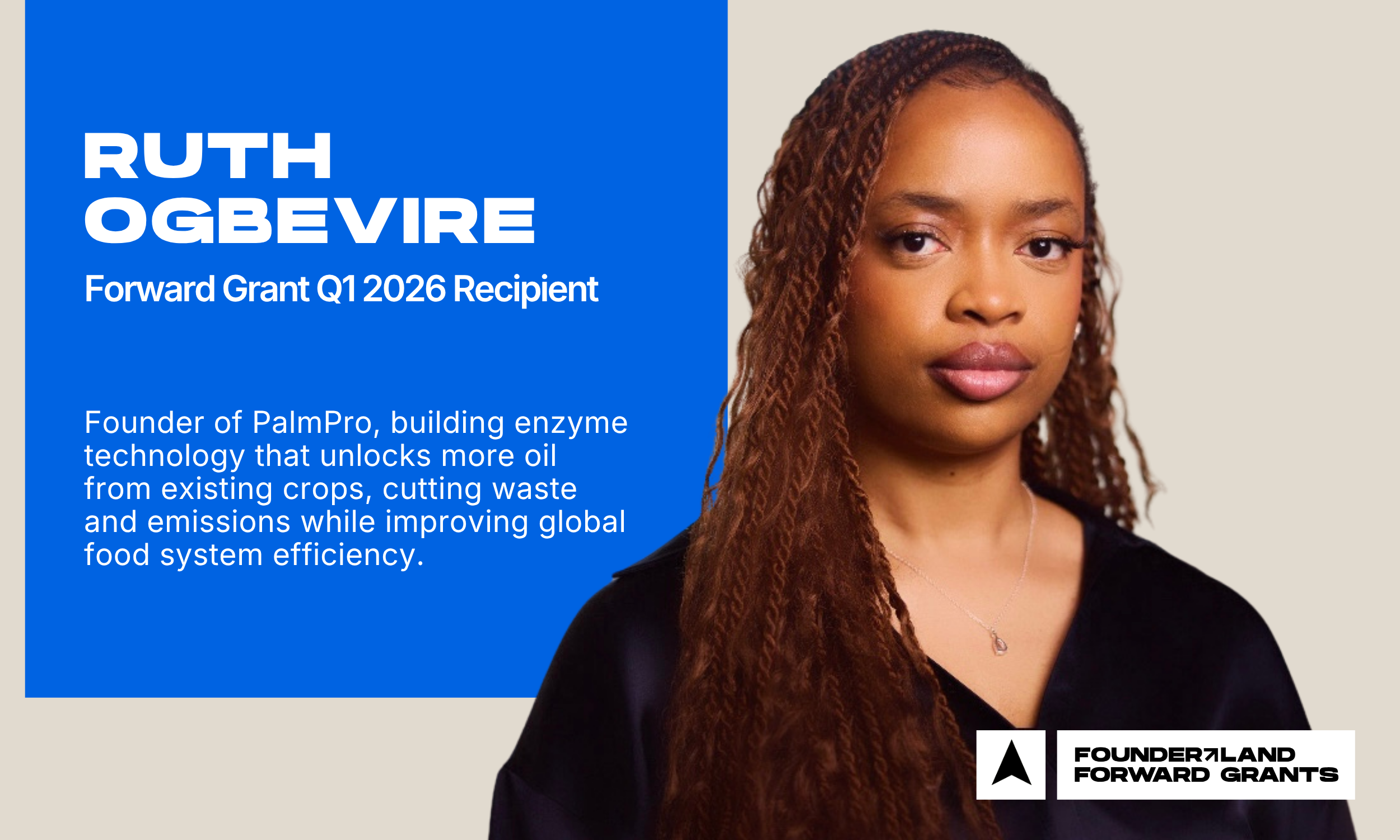 Founderland is pleased to announce Ruth Ogbevire and PalmPro as the recipients of the Q1 2026 Founderland Forward Grant.